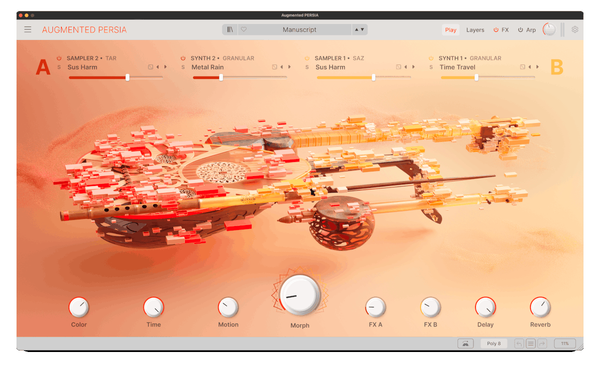 Augmented PERSIA is an exploration of a distinctive Persian and Middle Eastern musical palette, reimagined through a modern hybrid workflow. With 6 deeply-sampled instruments, expressive articulations, and Augmented’s multilayered synthesis architecture, it moves effortlessly from rooted acoustic timbres to cinematic movement, abstract texture, and contemporary sound design. Access production-ready sounds instantly with intuitive preset browsing, then shape and transform them with Morph, macros, modulation, sequencing, and effects.
