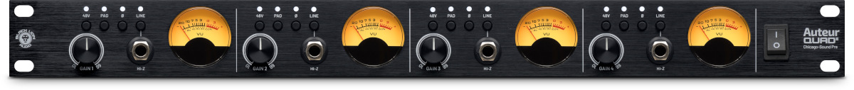 Um dem professionellen Studioalltag gerecht zu werden, hat Black Lion Audio die Features des Auteur Quad 2 erweitert. Neben den symmetrischen Ein- und Ausgängen im XLR-Format gibt es nun auch Klinkenbuchsen für Line- und Instrumenten-Signale. Während die Klinkenausgänge auf der Rückseite verbaut sind, um ein übersichtliches Kabelmanagement zu gewährleisten, sind die Eingänge auf der Vorderseite angebracht. Somit können Instrumente wie Gitarren und Keyboards schnell und unkompliziert angeschlossen werden. Genauso schnell schaltet man anhand eines dedizierten Tasters zwischen Line- und Instrumentensignalen um. Darüber hinaus hat der Hersteller jedem Kanal ein beleuchtetes VU-Meter spendiert, das Auskunft über den Pegel gibt.
