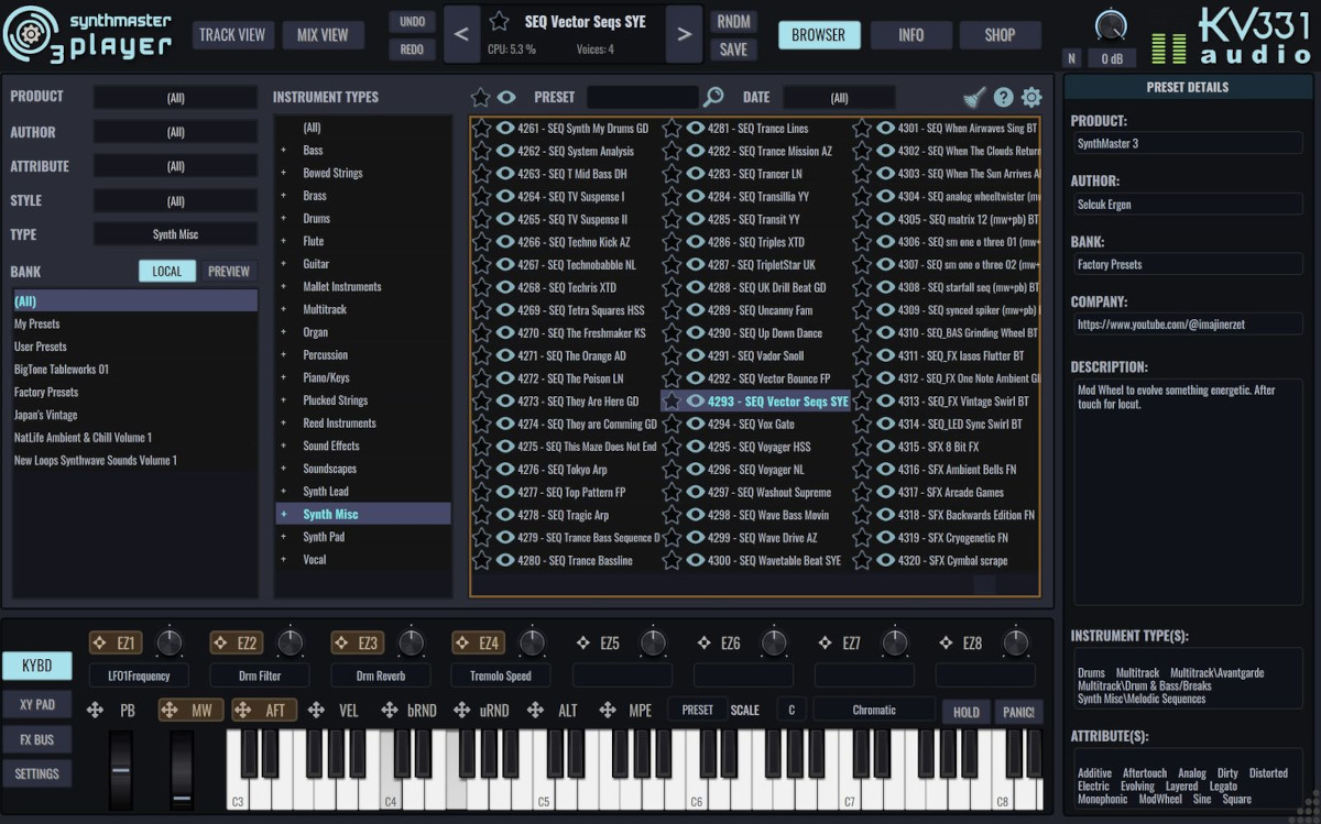 SynthMaster 3 Player can load SynthMaster One, SynthMaster 2 or SynthMaster 3 expansions. There are currently 58 expansion banks for a wide range of genres to choose from. Users can easily preview the presets in those banks and purchase them through the In-App Shop inside the plugin user interface.