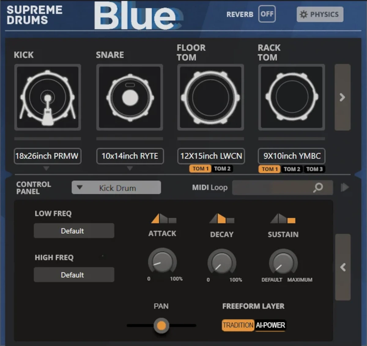 Beyond traditional playback, Supreme Drums Blue features a newly developed Physics Section, allowing users to modify drumhead and shell materials, adjust diameter and depth, fine-tune tension and tuning, and shape resonance characteristics. This modeling-based design provides near-limitless customization, empowering users to create unique drum sounds tailored to their productions.