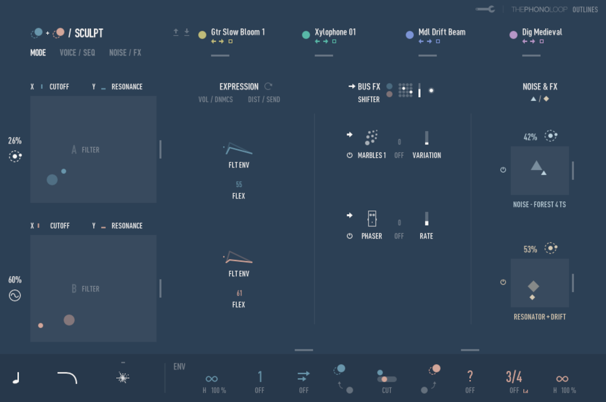 Sonically speaking, outlines’ engine is built around two independent granular layers, letting two different playback approaches — ANIMATED and SINGLE — run side by side. Since each layer runs on its own engine, it is possible to combine traditional polyphonic playback with granular or sequenced movement, meaning users can run two animated/granular layers, two polyphonic layers, or blend both approaches together. The layers can complement, contrast, or interact with each other, opening up a wide range of paths to explore. And as if all that was not enough to be getting on with, the engine also features a system of five different instrument modes — namely, DUETS, LENGTHS, ORBITS, SCULPT, and SINGULAR — that are designed to offer speedy starting points and keep the workflow intuitive while still encouraging deeper sound exploration.